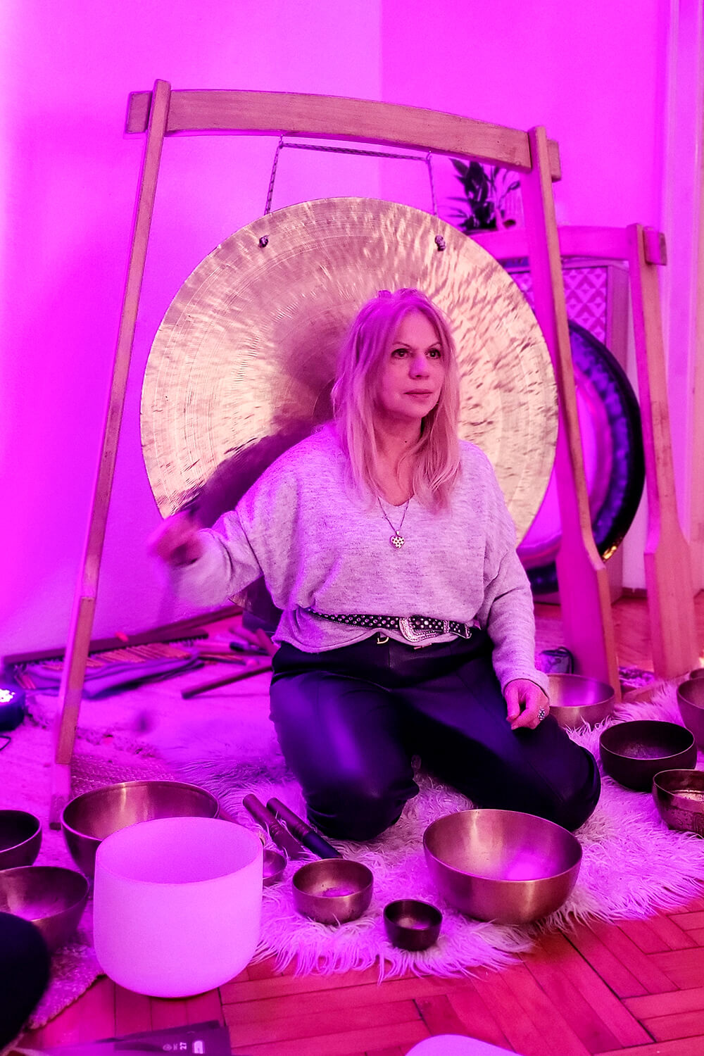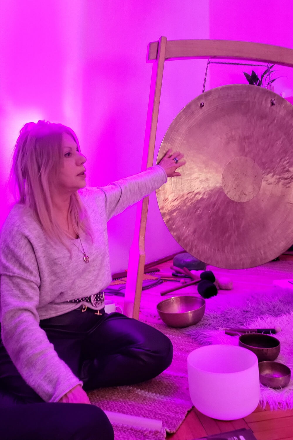 Gong proizvodi kompleksne, bogate harmonijske frekvencije koje ne deluju samo auditivno, već celim telom. Vibracije se prenose kroz nervni sistem, fasciju i telesne tečnosti, utičući direktno na autonomni nervni sistem.
